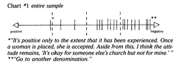 The questionnaire elicited twenty-four returns with one unreturned. (The task of obtaining contemporary addresses proved the first hurdle.) Only two of the respondents entered seminary with membership in other denominations (United Methodist and Latvian Lutheran) and graduated to serve in them. Seven respondents who entered seminary as Covenant members have changed or are changing their denominational affiliation. Thirteen are ordained, eight of them in the Covenant. Twelve women are pastors, seven of those in this denomination. Three of the four hospital chaplains are Covenant; both military chaplains are. There is one short-term missionary and one “home turf” missionary (a homemaker with young children). Fourteen put their names in for Covenant placement while nine did not. One had a call prior to the placement process. They were all asked to “mark an X where you perceive the Covenant denomination’s relationship to women in ministry to be.”