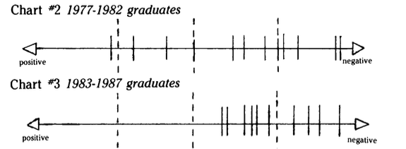 A comparison between the chronological first half of the time span (1977-1982) and the second half (1983-1987) seemed natural when both groups totaled twelve. Both groups also had two hospital chaplains and a military chaplain. Beyond that, there were sharp contrasts. The most visible indication of the differences in the two groups came in plotting the responses to the former exercises by seniority group. The respondents of the first half the decade indicated a significantly wider view of the denomination’s acceptance of ordained women than those of the latter half of the decade. The earlier twelve found five respondents in the most pessimistic quadrant, four cautiously so, two cautiously optimistic, and one clearly so (given her qualifying statements quoted from Chart #1). The chart of the latter half of the decade brought a sharp contrast to the first half with none of the women optimistic at any point about the denomination’s relationship to women ministers. All marks were on the pessimistic half of the spectrum; seven of the cautiously pessimistic and five of them in the most negative quadrant.